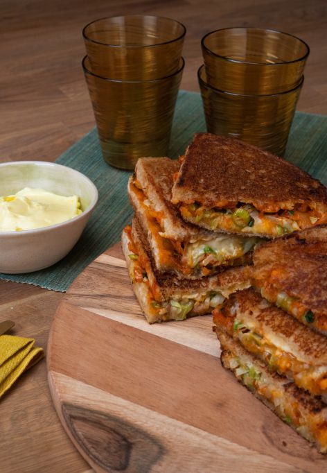 Geröstetes Sandwich aus zwei Scheiben Kastenweißbrot, gefüllt mit geschmolzenem Chili-Cheddar, gebratener Chorizo, roten Zwiebelringen, Jalapeños und frischen Kräutern. Serviert auf einem grünen Teller mit einem Messer, umgeben von Salzflocken, Pfefferkörnern, grünen Chilis und einer Pfeffermühle auf einem rustikalen Holztisch.