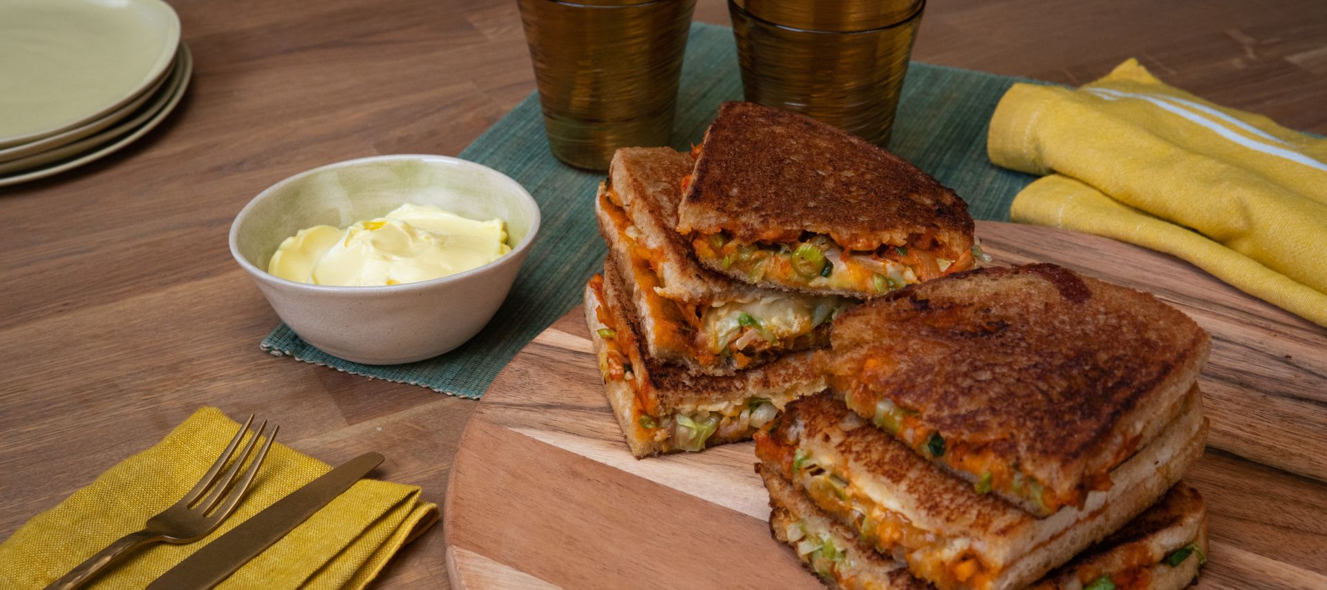 Beide Seiten der zwei Brotscheiben mit Kerrygold extra einstreichen. Die Thunfisch-Kimchi-Mischung, den Grünkohl und den Käse zwischen den Brotscheiben schichten.