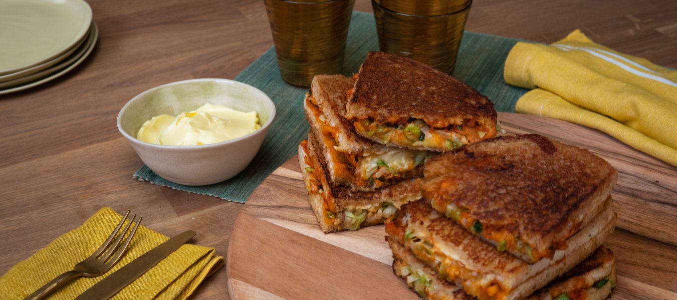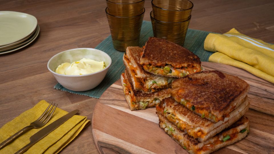 Eine beschichtete Pfanne bei mittlerer Hitze erhitzen und 1 EL Kerrygold extra ungesalzen hinzugeben, bis sie leicht schäumt. Das Sandwich in die Pfanne legen und 3–4 Minuten pro Seite braten, dabei beschweren, bis das Brot goldbraun und der Käse geschmolzen ist.