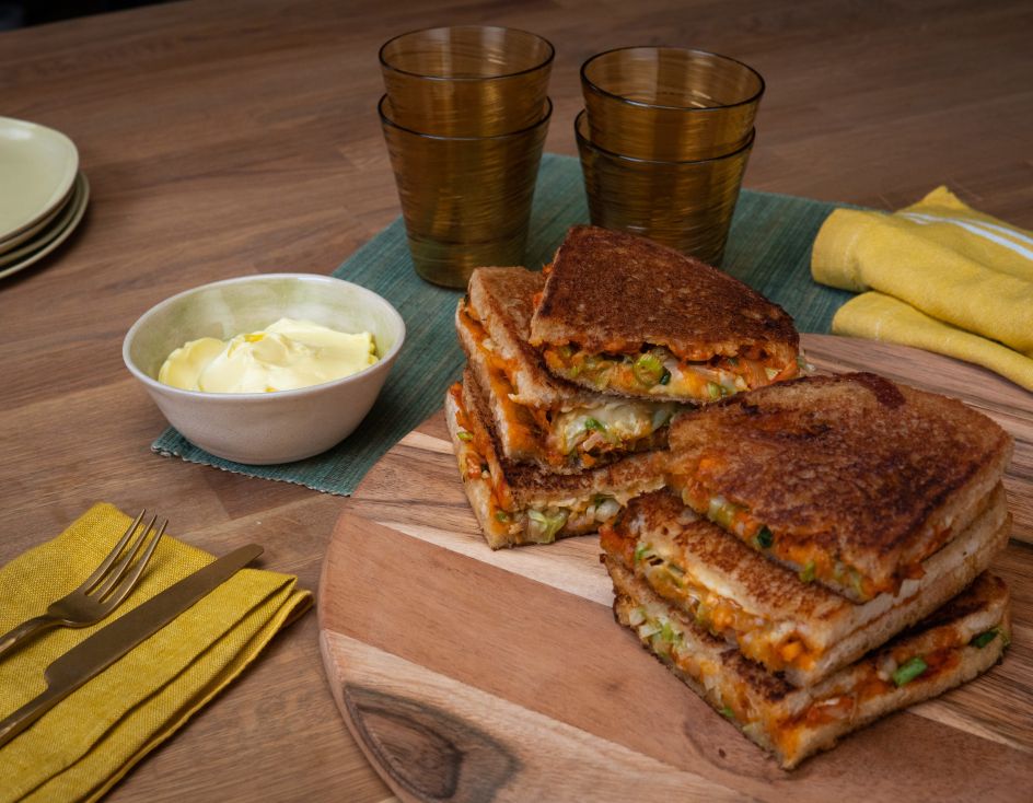 Die Pfanne mit Küchenpapier auswischen und ein weiteres ¼ Butter darin schmelzen lassen. Knoblauch und Basilikumstiele hinzufügen und einige Minuten sanft anbraten, bis sie duften (Hitze reduzieren).