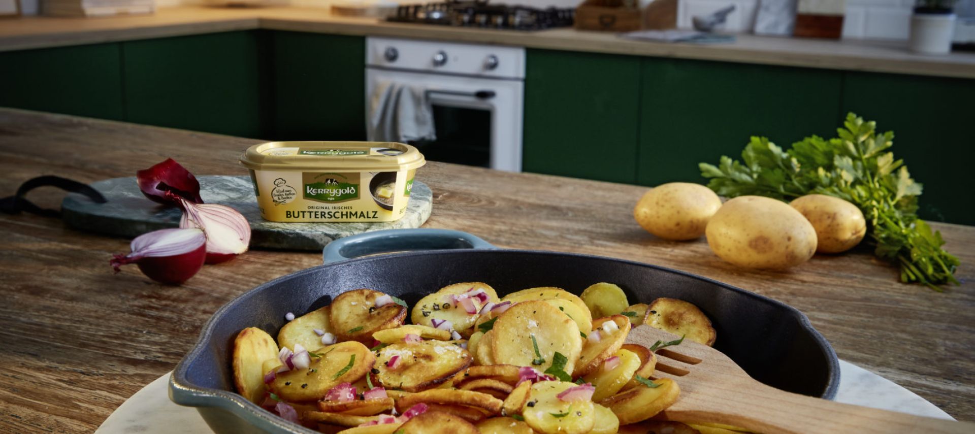 Eine Bratpfanne gefüllt mit in Butterschmalz gekochten Bratkartoffeln und roten Zwiebeln steht auf einer Küchentheke, umgeben von frischen Kräutern, Salz und ganzen Kartoffeln, mit einer modernen Küche im Hintergrund.
