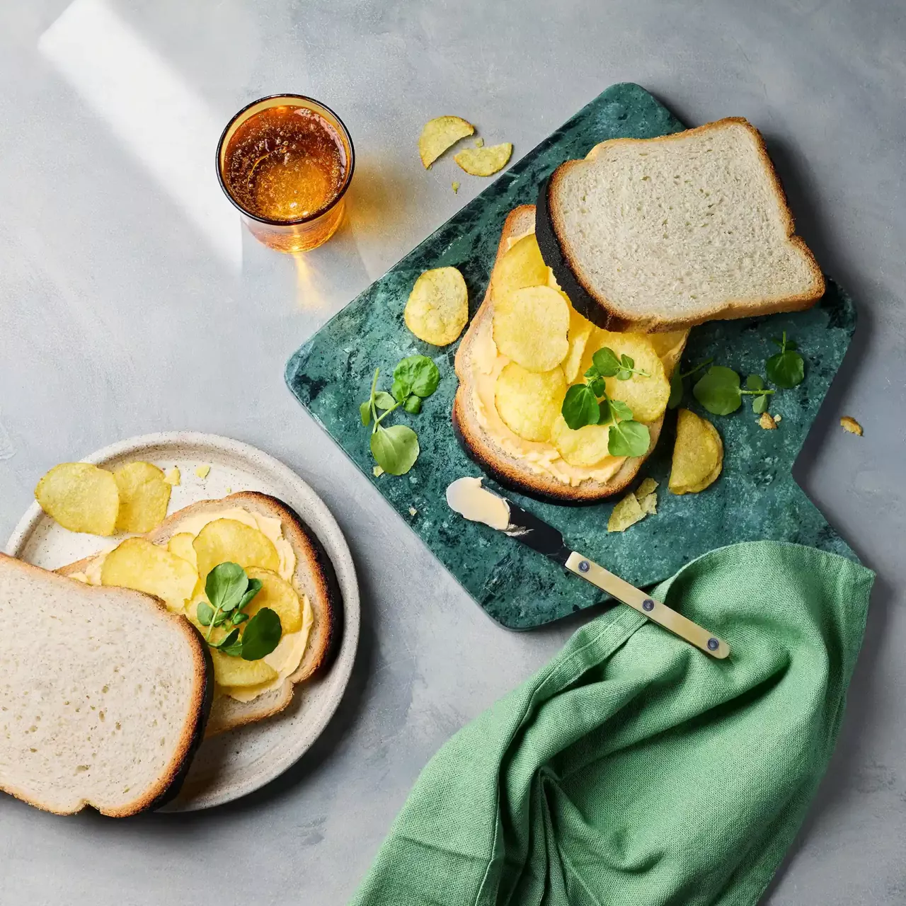 Weiches Weißbrot, großzügig Kerrygold Butter und der knusprige Biss von Kartoffelchips – der beste Beweis, dass die einfachsten Genüsse oft die schönsten sind.