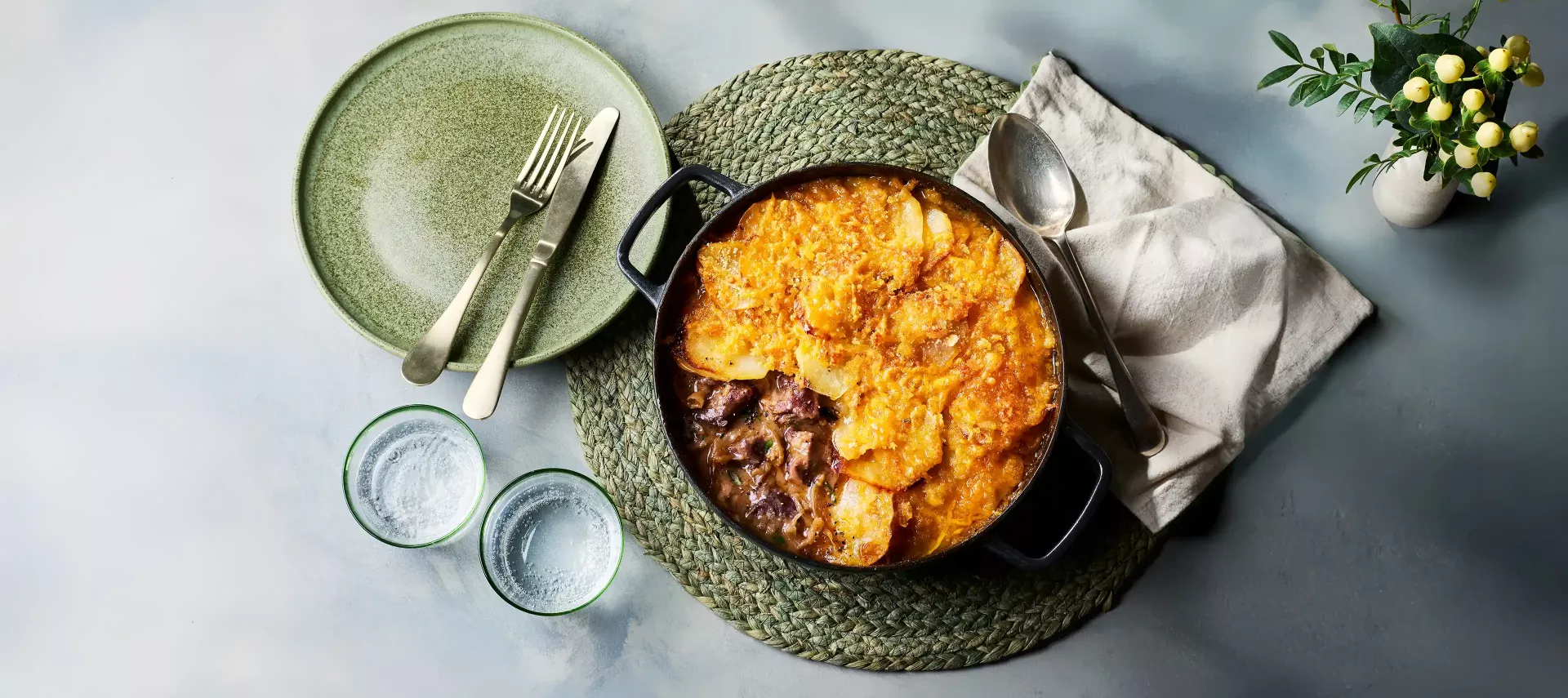 Zartes Lamm sanft geschmort mit Thymian und Zwiebeln. Abgerundet mit Schichten aus buttrigen Kartoffeln und einer goldenen Cheddar-Kruste. Ehrlich, herzhaft und gemacht, um es gemeinsam am Tisch zu genießen.